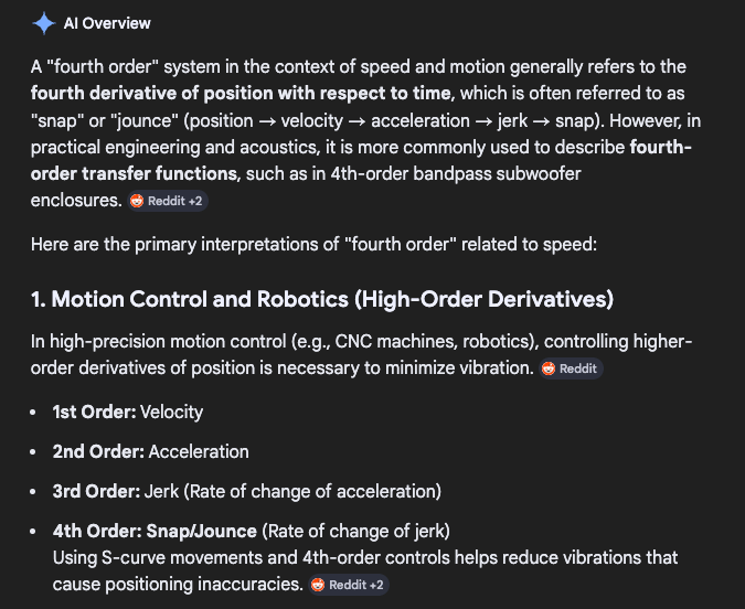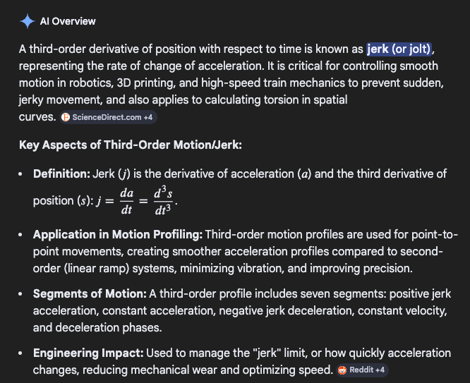 Okay, so it's getting a bit crazy. The pace of acceleration - itself a measurement of the change in velocity - is accelerating. It's amazing. What is the third order for speed? You'll be happy to know I asked Gemini: